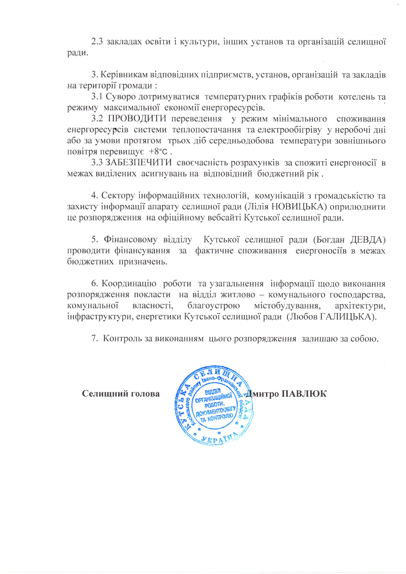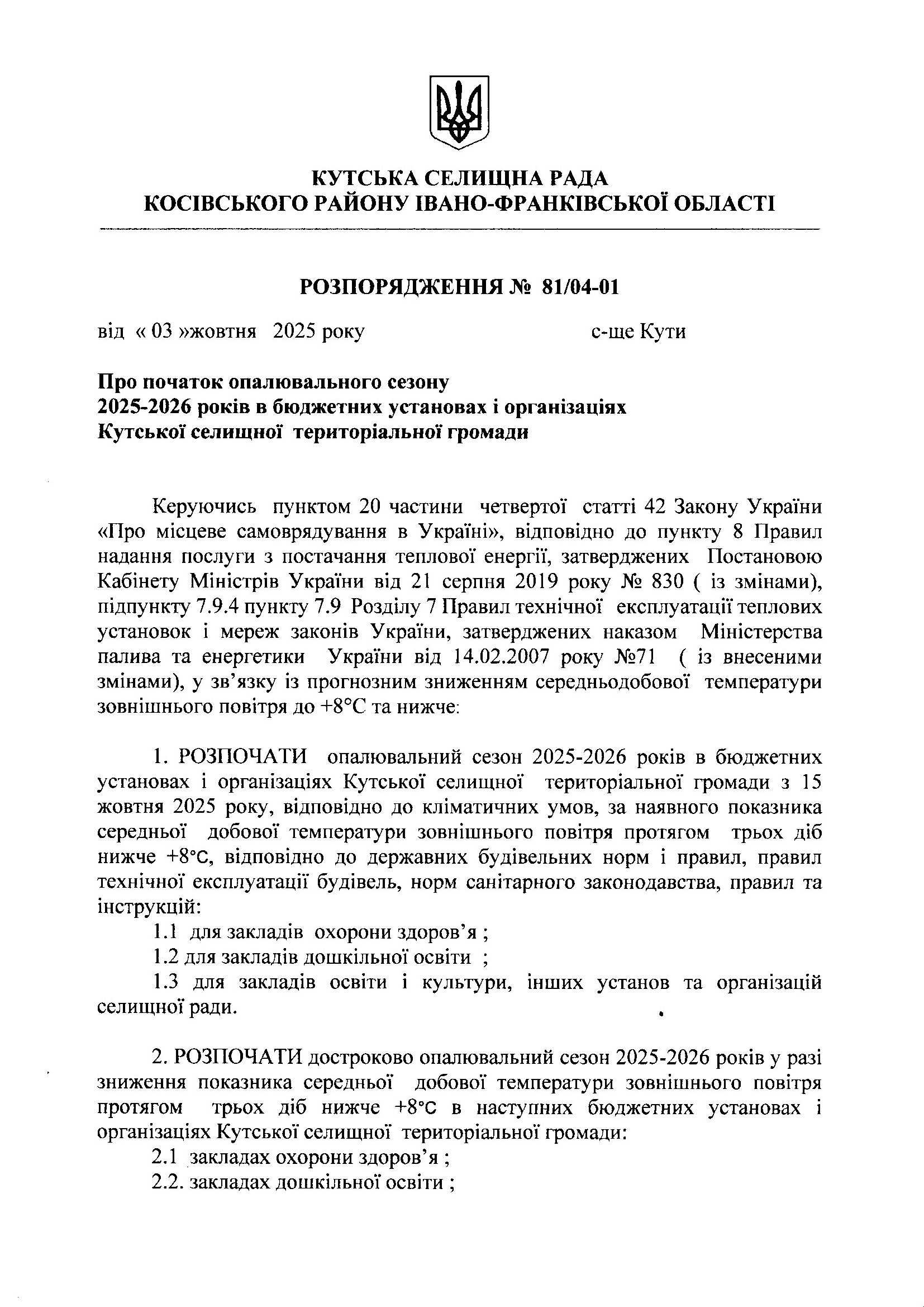 Про початок опалювального сезону 2025-2026 років в бюджетних установах і організаціях Кутської селищної територіальної громади