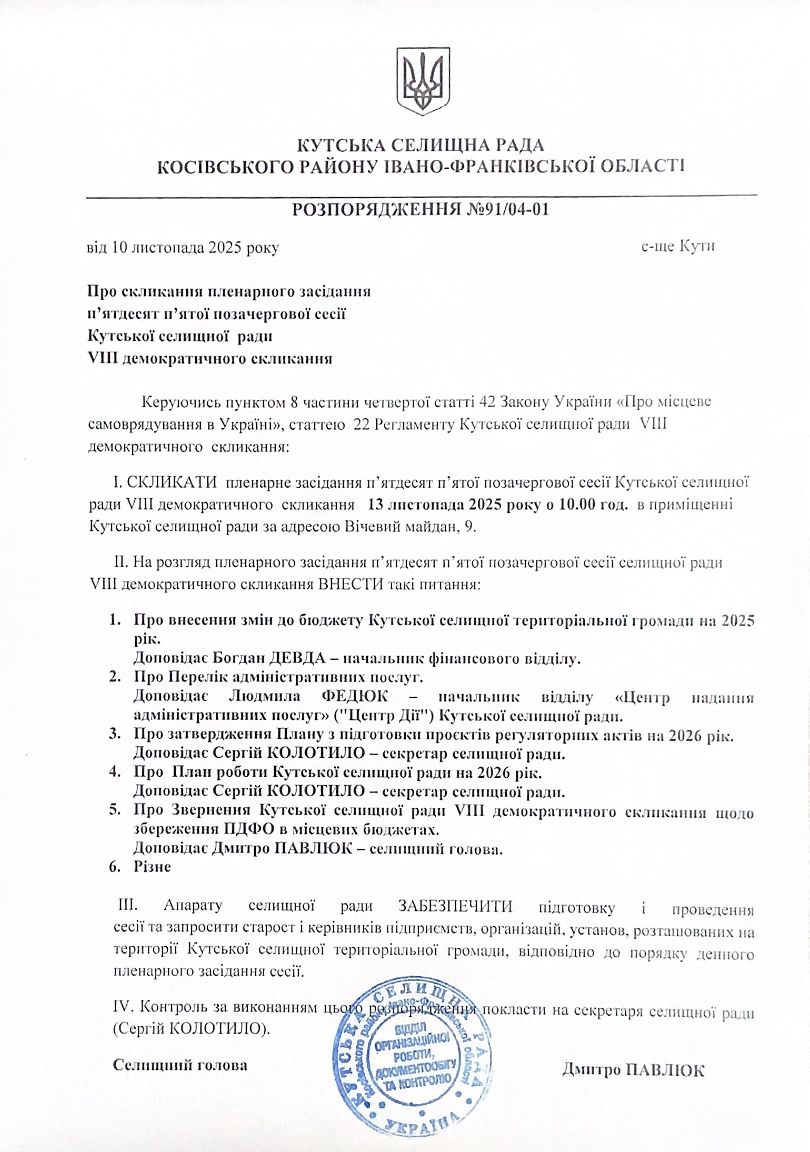 Про скликання пленарного засідання п’ятдесят п’ятої позачергової сесії Кутської селищної ради VIII демократичного скликання