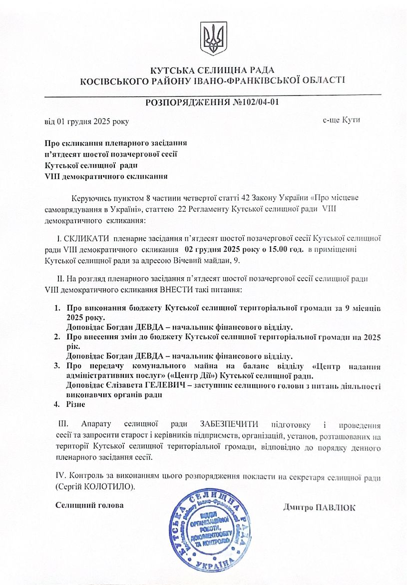 Про скликання пленарного засідання п’ятдесят шостої позачергової сесії Кутської селищної ради VIII демократичного скликання