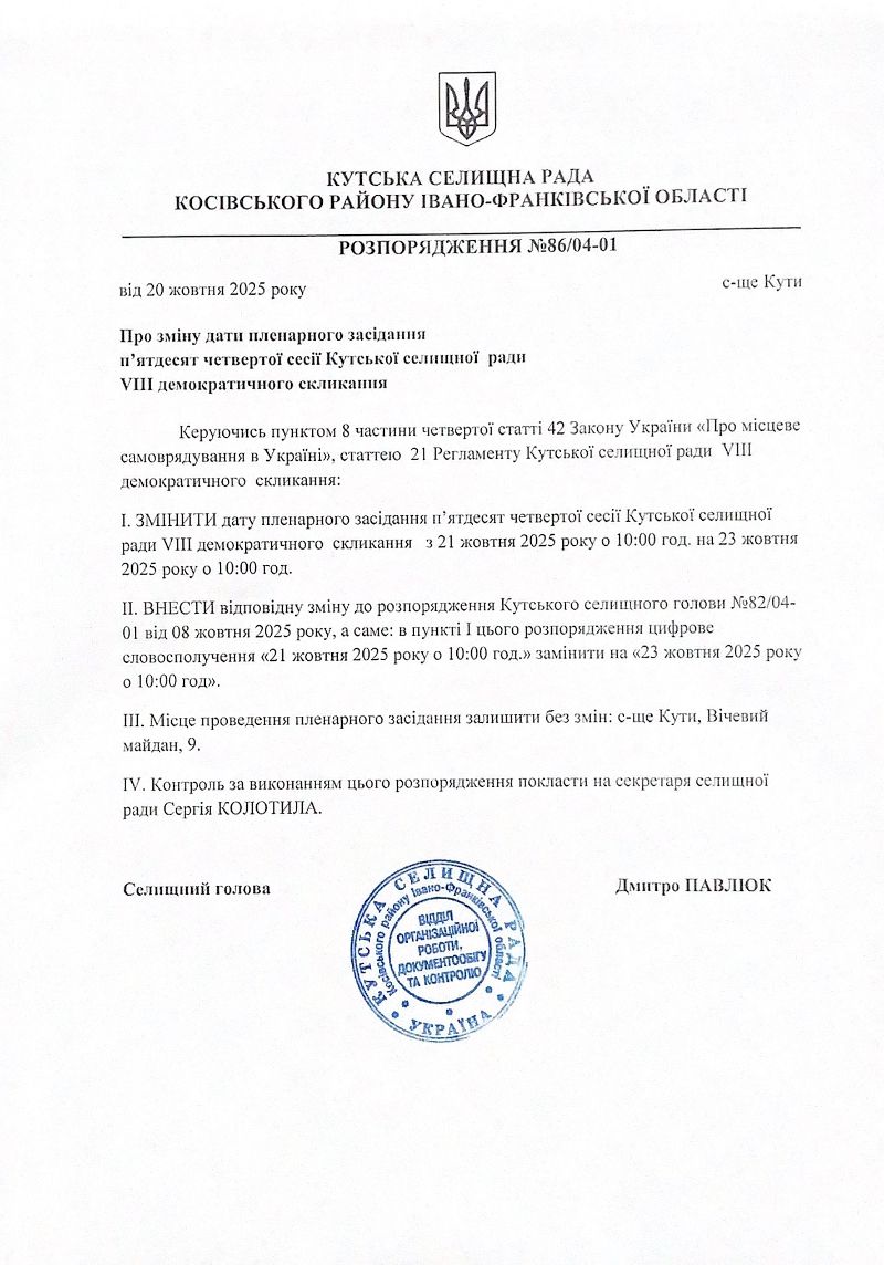 Про зміну дати пленарного засідання п’ятдесят четвертої сесії Кутської селищної ради VIII демократичного скликання