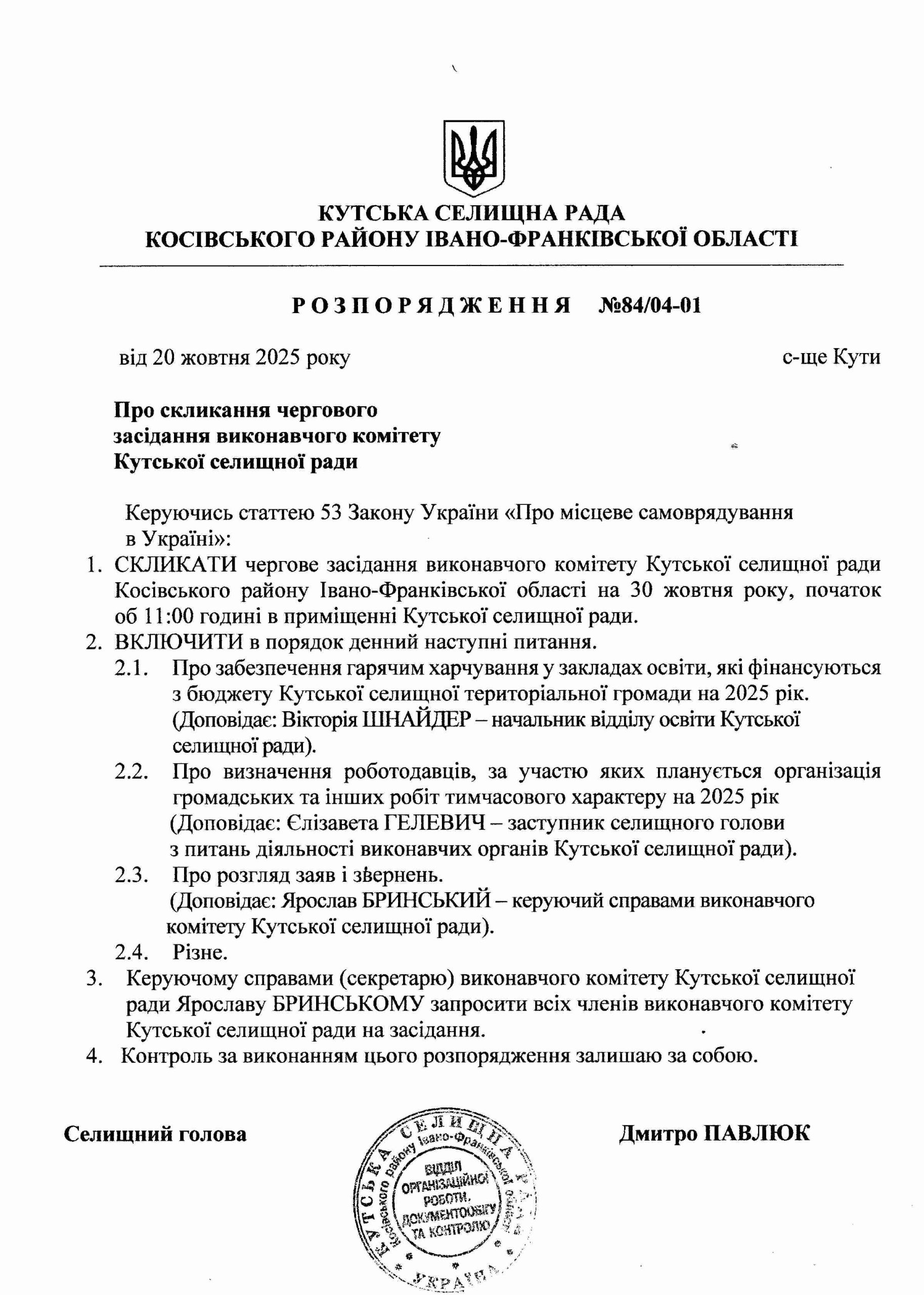 Розпорядження про призначення дати та порядку денного чергового засідання виконавчого комітету Кутської селищної ради