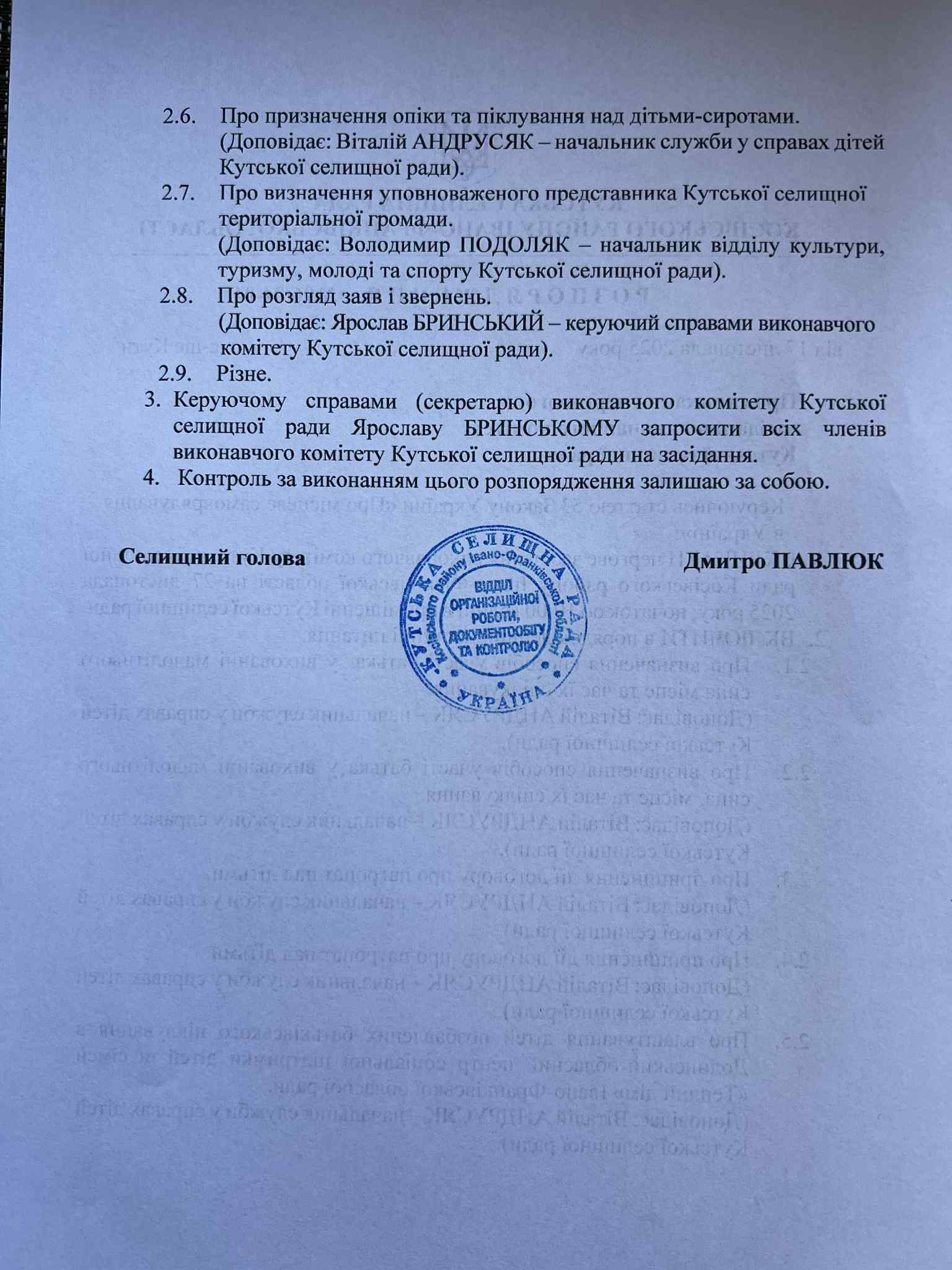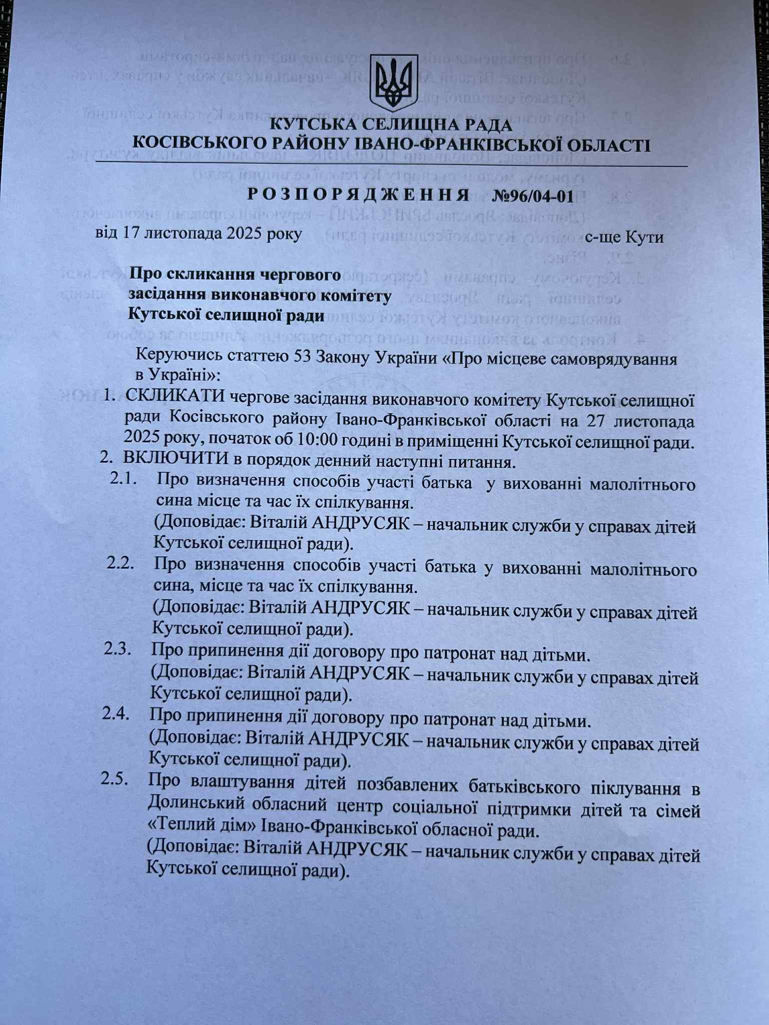 Розпорядження про призначення дати та порядку денного чергового засідання виконавчого комітету Кутської селищної ради