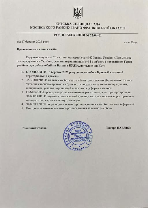 Для вшанування пам’яті і в зв’язку з похованням Героя російсько-української війни, жителя селища Кути БУДЗА Богдана Михайловича, 18 березня 2026 року оголошено днем жалоби в Кутській громаді.