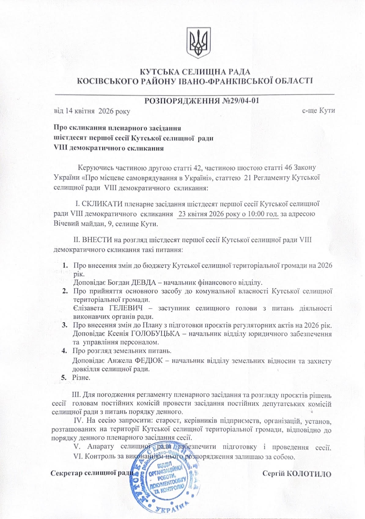 Про скликання пленарного засідання шістдесят першої сесії Кутської селищної ради VIII демократичного скликання