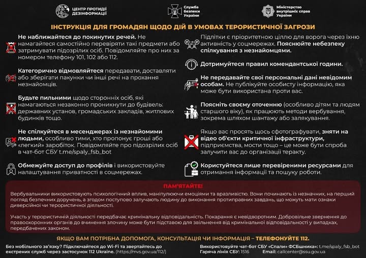 Центр протидії дезінформації спільно зі Службою безпеки України та Міністерством внутрішніх справ України розробили інструкцію для громадян щодо дій в умовах терористичної загрози.