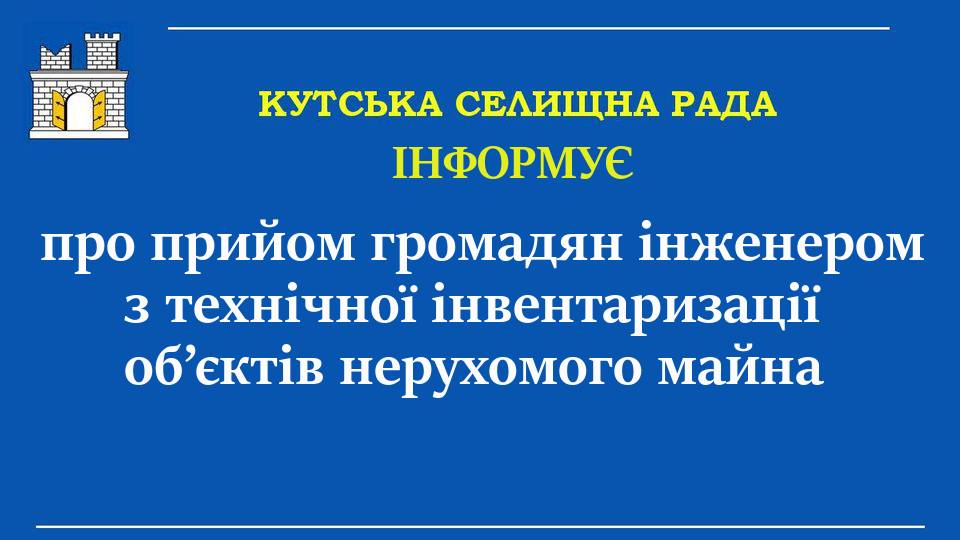 Повідомляємо, що у приміщенні ЦНАП Кутської селищної ради щомісяця проводитиме прийом громадян та надаватиме консультації інженер з технічної інвентаризації об’єктів нерухомого майна МОКРИНЧУК Ігор Ярославович.