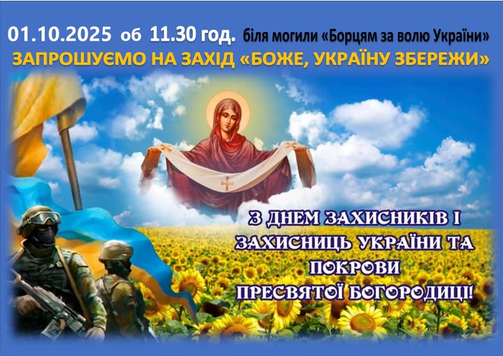 Запрошуємо жителів та гостей Кутської громади долучитися до тематичного заходу “Боже, Україну збережи” з нагоди відзначення державних свят: Дня захисників і захисниць України, Дня Українського козацтва та 83 річниці створення Української повстанської армії, який відбудеться 01 жовтня 2025 року об 11:30 годині, в селищі Кути, біля могили “Борцям за волю України”.
